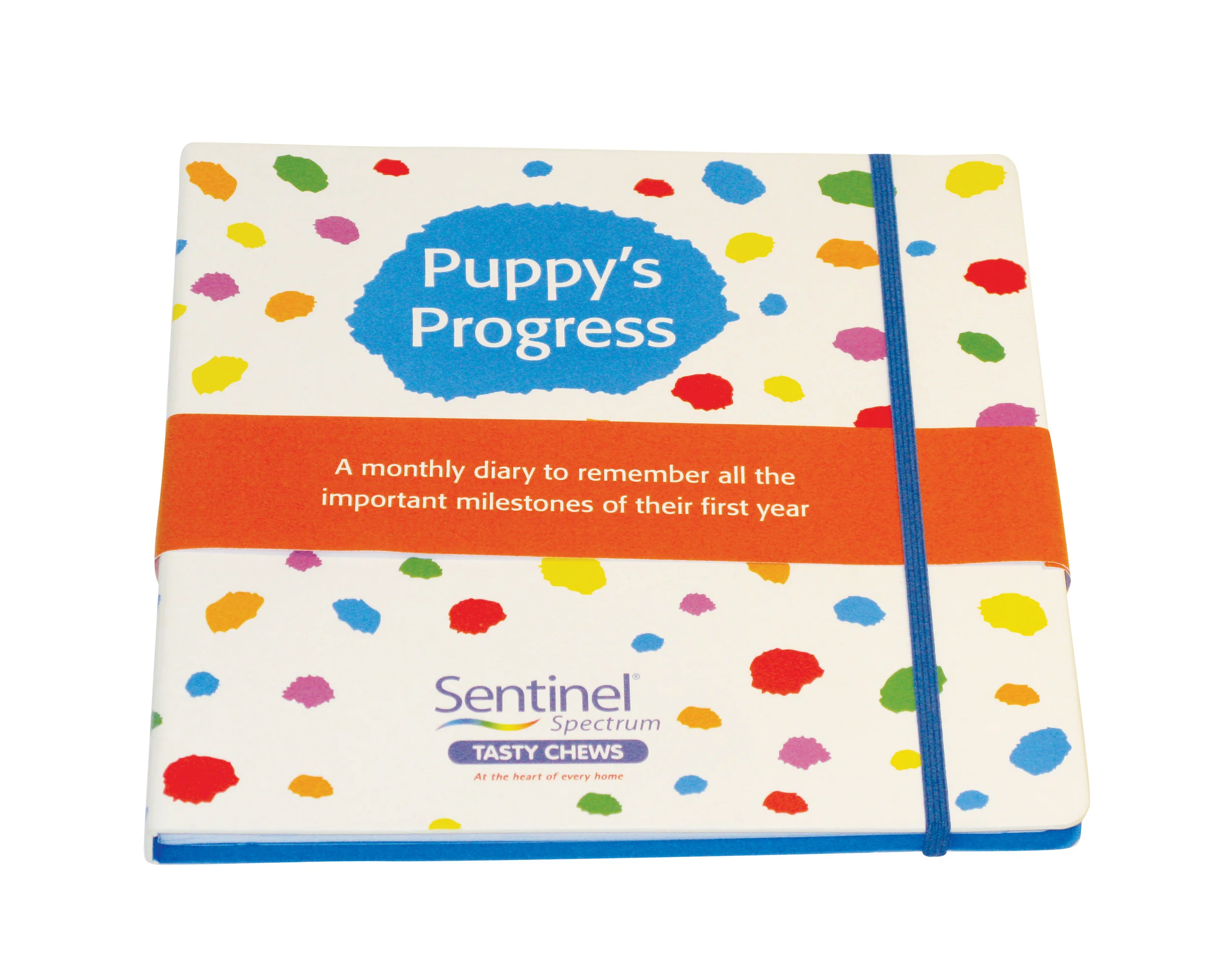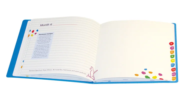 The equivalent of a Baby Book, this was distributed to vets by Novartis Animal Health, for them to give to new owners of puppies. The book was a guide to what to expect in a puppy's first year, and had room for notes and pictures, as well as useful information about flea and worm prevention and a product sample.